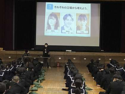 NTTドコモの方に来ていただいて、2年生「スマホ・ケータイ安全教室」を行いました。