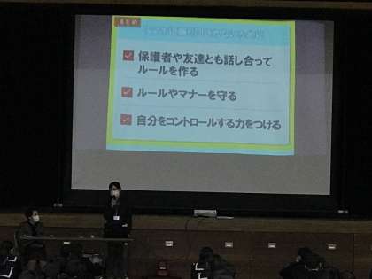 スマホやケータイは、便利なコミュニケーションツールですが、事件やトラブルに巻き込まれないように「正しく使うためのポイント」を学習しました。また、「学校」「睡眠」「食事」などの必要な時間を超えた使いすぎがないよう、保護者と話し合ってルールを作って自己管理することについてもお話がありました。