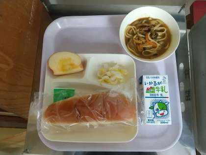 本日の給食は ●カレーうどん ●白菜の甘酢和え ●林檎 です。