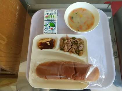本日の給食は ●豚肉のケチャップソテー ●コーンスープ ●焼きプリン です。