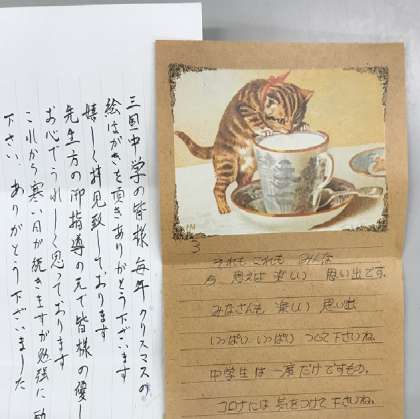 生徒会でクリスマスカードの図案を募集し、できあがったクリスマスカードに生徒がメッセージを書きました。できあがったカードを町会の方を通じて地域のお年寄りの方に配付させていただきました。
