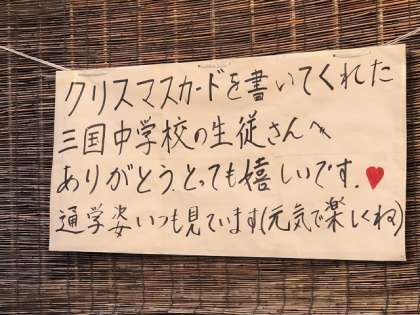 クリスマスカードへのお礼のメッセージをいただいたり、掲示していただいたりしています。ありがとうございます。いちだんと寒い日が続きますが、くれぐれもご自愛ください。
