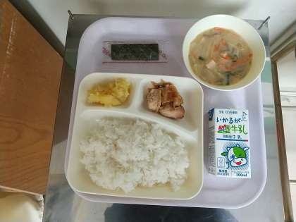 本日の給食は ●鶏肉の甘辛焼き ●かす汁 ●栗きんとん です。