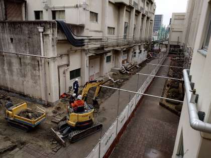 3学期に入って体育館横で排水管改修工事が行われています。