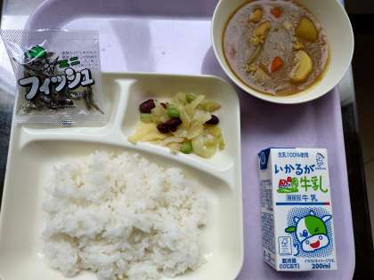 チキンカレーライス ビーンズサラダ ミニフィッシュ 牛乳 です。