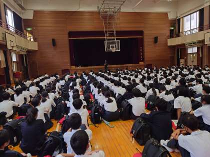 明日から1年生は貝塚市にある大阪府立少年自然の家で一泊移住を行います。5限に《一泊移住前日指導》を体育館で行いました。
