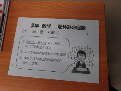 各教科の授業で《夏休みの宿題》が配布されています。1学期の復習、9月の中学生チャレンジテスト(3年生)、課題テスト(1・2年生)に向けた準備です。もちろん早めに仕上げて、提出期限も守りましょう。