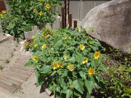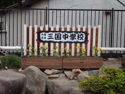 管理作業員に大切に育ててもらっている《向日葵》が太陽の日差しを受けて咲き始めました。池の近くに手作りの「校名プレート」も作ってもらいました。
