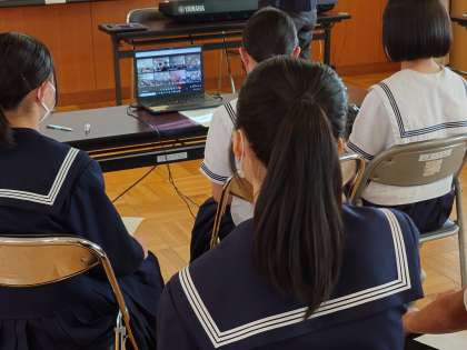 生徒会が制作した中学校生活・部活動紹介動画をGoogle Classroomで配信し、小学校の児童に視聴してもらったり、小学生からの中学校生活についての質問に生徒会が答えたりする取組みでした。