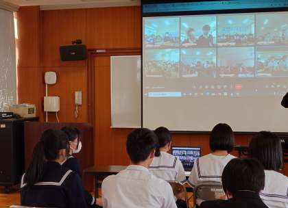 中間テストが終わり、午後からは本校の生徒会執行部と校区3小学校の6年生がオンラインで交流する《小中交流会》を実施しました。