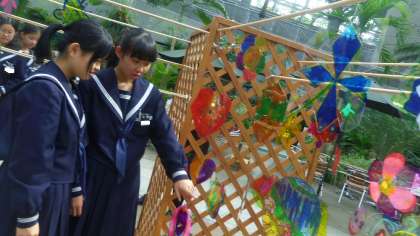 10月17日(土)、咲くやこの花館にて、第24回総合文化祭の美術部合同鑑賞会とワークショップが行われました。大阪市の中学校の美術部120名が集まり、塩ビ板で作った作品を展示しました。デザインや作品の形もそれぞれ工夫され、会場の天井から光が射すと塩ビ板を通してきれいな色が地面に映し出される、とても素晴らしい作品になりました。この作品は総合文化祭会期中(25日まで)会場に展示されます。