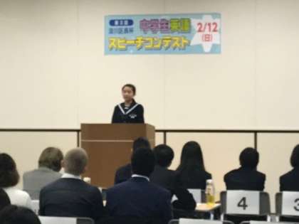 出場した生徒のスピーチはどれも素晴らしく、堂々とした様子は中学生とは思えないくらいでした。本校の2名も、それぞれの思いを英語で一生懸命伝えました。そして、2年の小林さんは、見事、“Good Speech賞”(優秀賞)を獲得しました。