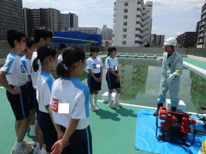 中段:地域防災リーダーの方のご指導で可搬式ポンプを使った放水の手順を学習しました。ポンプのエンジン始動には全員四苦八苦。コツがなかなかつかめません。
