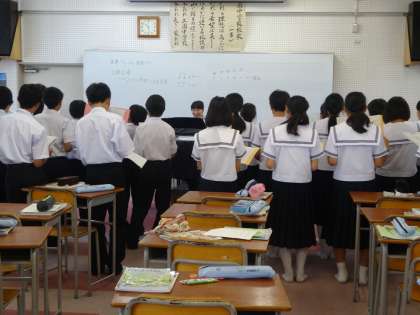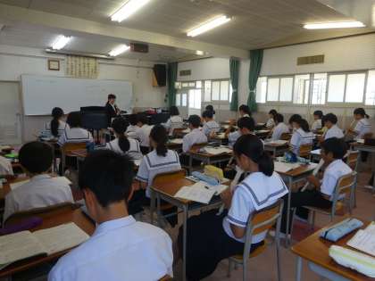 2時間目音楽室で1年2組の研究授業が行われました。校歌合唱、アルトリコーダー「喜びの歌」練習、「smile again」二部合唱の練習をしました。