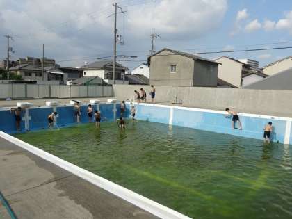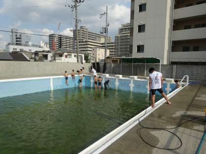 男子バスケットボール部員は、今日、水ごけのついたプールをきれいにしてくれました。プールでの水泳の授業も明日以降徐々に始まります。