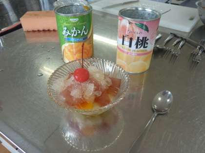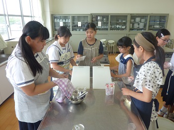 ゲーム形式で英語による自己紹介から始まり、調理器具や調理方法もすべて英語。美味しく出来上がったフルーツシャーベットをまえに、話し声一つなく黙々と食べました。味の感想も英語で言うなど英語漬けの時間を過ごしました。26日、27日と続きます。
