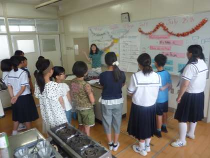 7月25日(火)三国英語村が三国中学校調理室で開かれました。中学生5名、西三国、三国、新高の3小学校から9名の合計14名が参加しました。