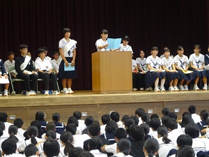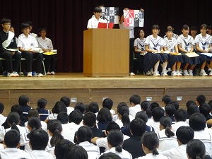 今日の6時間目、生徒会役員選挙が行われました。体育館で選挙管理委員の司会で応援演説と立候補者演説が行われた後、各学級で投票が行われました。放課後開票され、会長1名、副会長2名、執行委員5名が決まりました。活発なあいさつ活動をきっかけに、明るく楽しい学校づくりに力を発揮していくことを期待しています。
