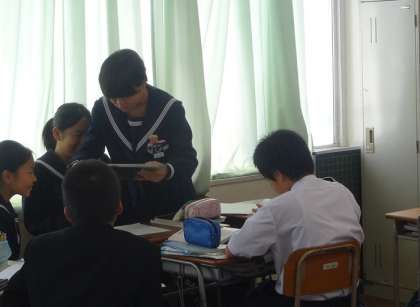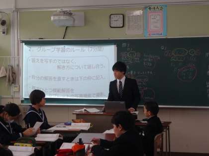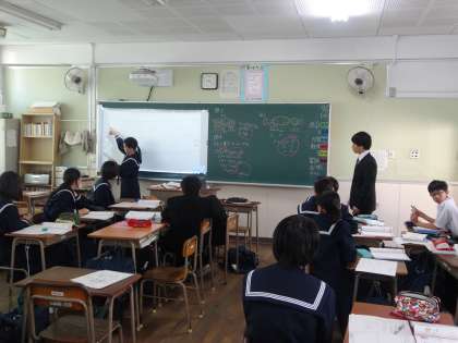 グループで話し合ったことをまとめて、タブレットで撮って、スクリーンに写し、みんなに解き方を説明しました。