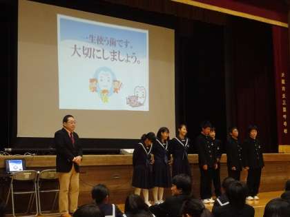 歯と口の健康に対する関心を高め、健康な生活を送るための学習をしました。最初に保健委員が事前アンケートの結果の報告と歯に関するクイズをしました。続いて学校歯科医の先生から、食生活や生活習慣の乱れと歯と口の病気の関連や予防の仕方についてお話していただきました。今日学習したことをふだんの生活に生かして、一生お世話になる歯を大切にして、いつもでも健康な生活を送ってほしいと思います。