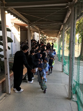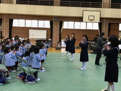 新高幼稚園の園児さんが、本校体育館で吹奏楽部の演奏を鑑賞しました。