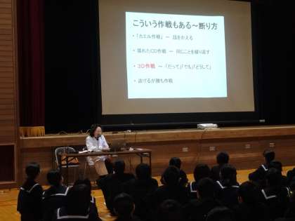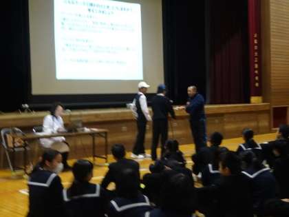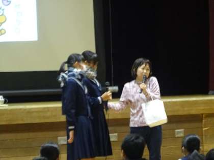 学校薬剤師の先生に来ていただき、人生や社会を壊す違法薬物の恐ろしさについて学習しました。3年生の先生と生徒も参加した寸劇もまじえて学習しましたが、違法薬物等の誘惑に負けない強い心をみんながもってほしいと思います。