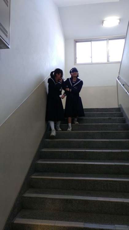 写真:手引き体験。声をかけながら、アイマスクをつけた人が安全に移動できるよう、相手の立場に立って誘導しました。