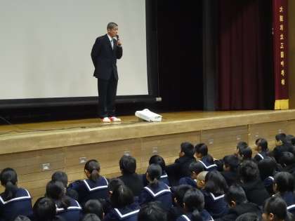 校長先生からは、冬休みに向けての心構えの話の後、プロジェクターを使って、淀川区の「ヨドネル」大規模調査の結果をもとに、睡眠の大切さについて話がありました。睡眠時間が減ってくると、疲労度が増し、学習意欲が低くなってきます。睡眠時間の減る原因で大きいのはスマートフォン等の使い過ぎです。平日のスマートフォンの利用が3時間を超すと睡眠時間が減り、学習意欲や成績も低くなってくるそうです。今日渡された個人票をもとに、健康な生活ができるよう毎日の生活を振り返ってみてください。