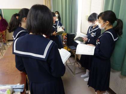 「歌唱」の単元で、タブレットを各パートの音源にして、班で練習の目標を持ち、話し合いながら練習しました。