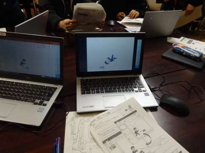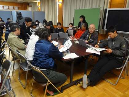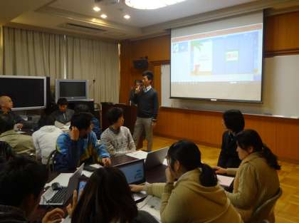 今日の授業者の先生から授業のねらい等を話してもらった後、教育コンテンツとパワーポイントを使った教材作りについて研修しました。