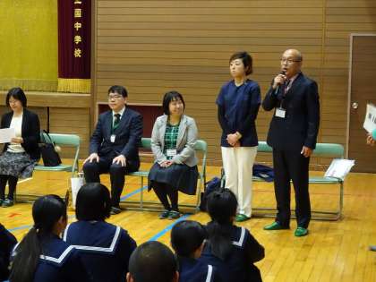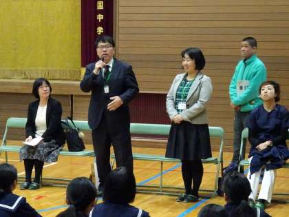 最初に体育館に集まり、高校の紹介と出前授業の内容についてそれぞれお話していただきました。その後、体験場所に移動しました。