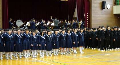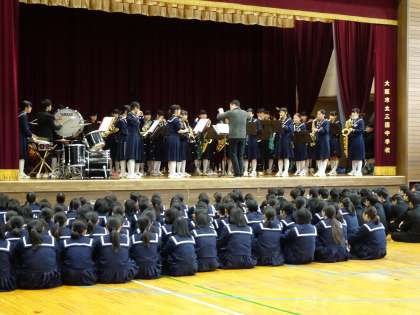 生徒会主催の「卒業生を送る会」が1時間目に体育館で行われました。拍手で3年生が入場した後、吹奏楽部から「虹色の未来へ」など3曲の演奏が贈られました。