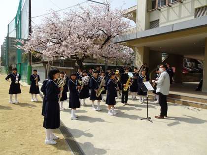 蒲生中学校から橘副校長が着任されました。吹奏楽部の演奏でお迎えして、多目的室で地域やPTAの方々、教職員がそろって着任式を行いました。