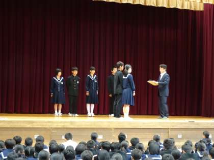 朝、全校集会が体育館で行われました。認証式では、各学年1組の学級委員長に代表として認証状が渡されました。