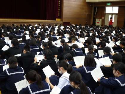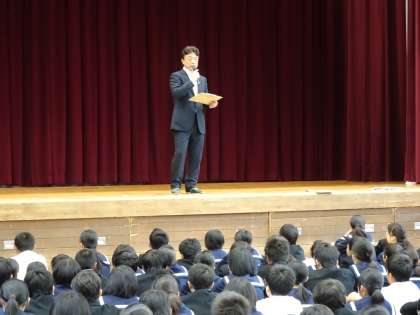 「いじめについて考える日」について、校長先生から「手紙」の歌詞をもとに「誰にも話せない(と思っている)悩み」を、同じように悩んだ経験をもつ身近な大人にも相談してほしい。「いじめは絶対許せない」、「解決に向けて身近な大人は必ず協力する」と話されました。この日、「いじめアンケート」も実施されました。
