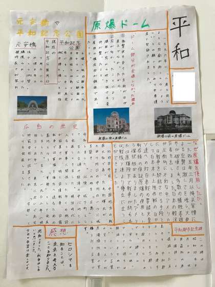また、明日5/10(木)の5時間目に被爆体験伝承者講話として、広島県から遠原弘子さんが講師としていらっしゃいます。「被爆体験伝承者」は、被爆者から直接体験の話を何回も聴き取り、その記憶と思いを受け継ぎ伝えるために活動されています。修学旅行で訪れる広島での平和学習に向けてしっかり話を聴きとってほしいと思います。