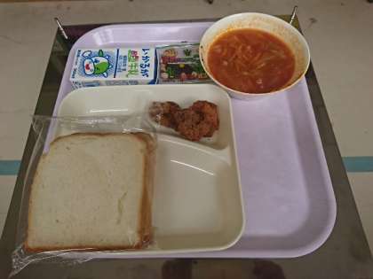 給食の「ミネストローフ」には、にんじん、たまねぎ、キャベツとトマトが入っています。