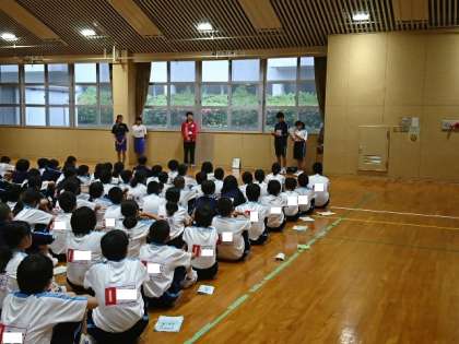 愛知県から二泊三日の林間学習に来ていた中学校の2名の生徒代表と一緒に夕べの集いを行いました。お互いの学校や地域の紹介もしました。
