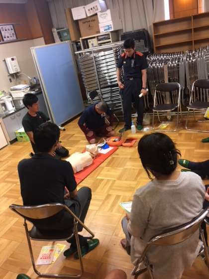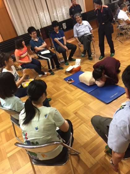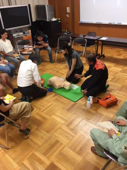 人工呼吸の練習を行いました。その後、倒れている人