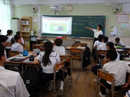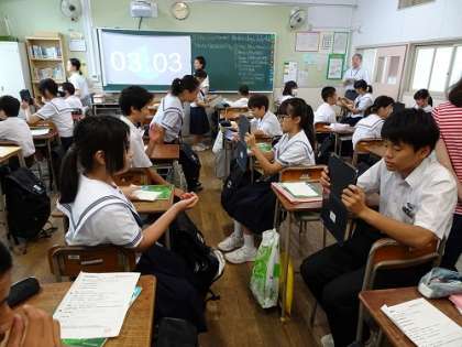 1年2組の英語の授業では、ICT機器を使って、ペアで自己紹介の動画に撮って、班で感想を話し合ったりしました。ネット環境の不安定さの課題も出てきました。