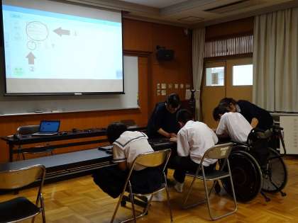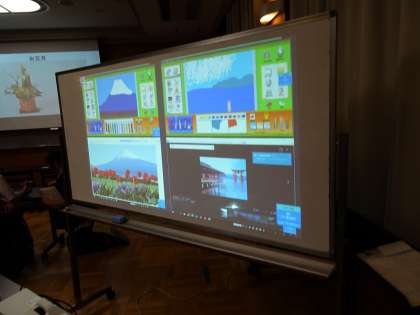 授業内容が参観者にわかりやすいように、生徒の様子や生徒のタブレットの画面を教室横のホワイトボードに投影する工夫もありました。