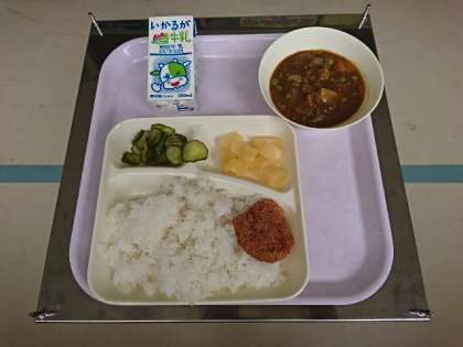 今日の給食献立は「ビーフカレーライス」と「一口ヒレカツ」です。どちらも米粉を使って調理されています。今日の給食も、残さずに美味しくいただきましょう。