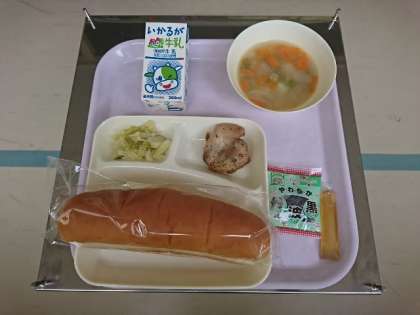 今日の給食献立は「鶏肉の香草焼き」と「スープ煮」です。