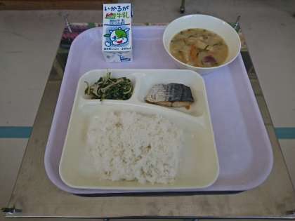 今日の給食献立は「さごしのしょうゆだれかけ」です。