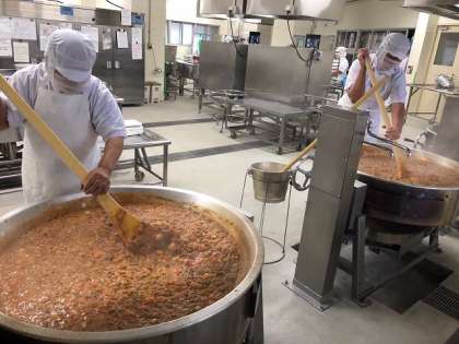 下の写真は、美津島中学校でハヤシライスを作っている調理風景です。