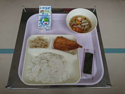 今日の給食献立は「いわしのフライ」「五目汁」です。