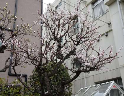 春の陽気に正門の白梅が花をつけています。今日は、管理作業員さんが池の掃除をしてくれましたので、コイやカメも気持ちよく泳いでいます。