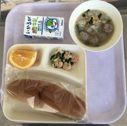 今日の給食献立は「エビとチンゲンサイのいためもの」「中華がゆ」です。