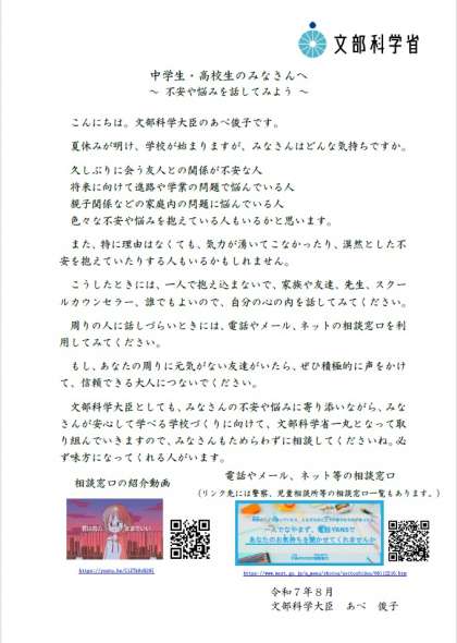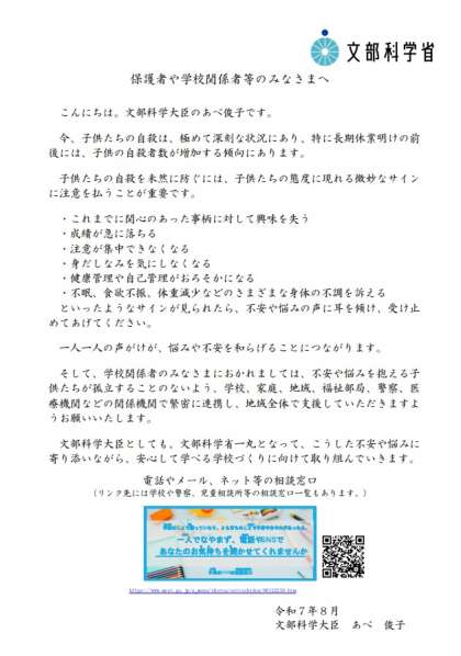 長期休業明けに向けた自殺予防に係る児童生徒や学生、保護者等への 文部科学大臣メッセージについて