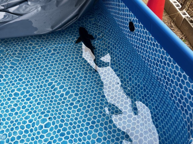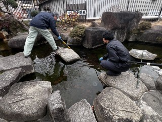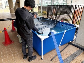 正門にある池の工事にともない、鯉と亀さんが一時的に簡易プールにお引越しです。